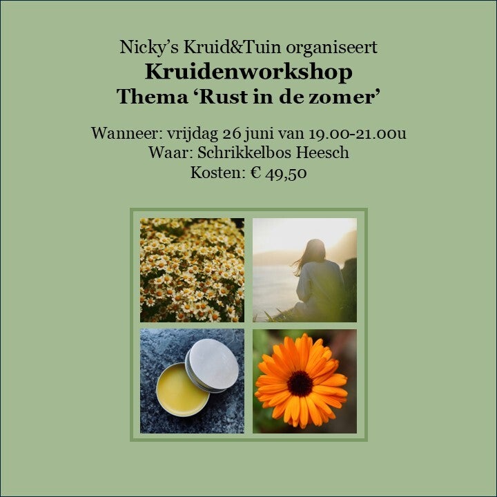 Hoe wil jij de zomer ingaan? Zie je de vakantiestress al voor je? Of kun je jezelf al in alle rust voorstellen, lekker lezend of wandelend? Tijdens deze kruidenworkshop zorgen we ervoor dat je afgestemd wordt op een rustige zomer, hoe die er voor jou dan ook uit mag zien, en maken we kruidenmiddeltjes die hierbij kunnen helpen.
