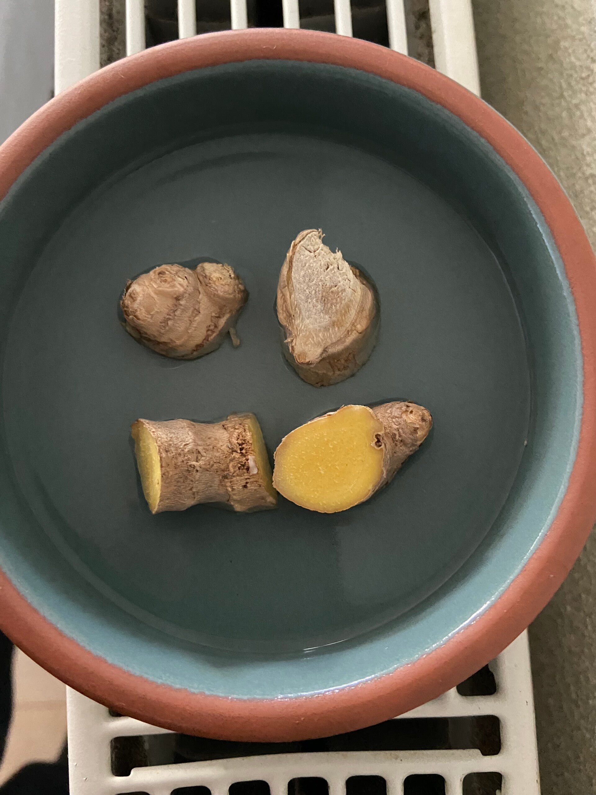 Binnen ben ik al begonnen met een aantal kweek-experimenten. Naast een avocado pit en een lychee pit die ik probeer te laten ontkiemen, ben ik ook met gember en zoete aardappel aan de slag gegaan. Beide gekocht bij een biologische supermarkt. De gember in grove stukken gesneden en met de snijkant in het water gelegd. Het schaaltje staat op de verwarming. Eens kijken of dit lukt! Uit eventuele plantjes ontstaat weer een nieuwe gemberwortel die je kan gebruiken in keuken of voor de geneeskrachtige of spirituele eigenschappen. De zoete aardappel kweek ik dit jaar op twee manieren. Eén zoete aardappel heb ik doorgesneden en in het water gezet, de andere in de vochtige aarde in een kweekbak gelegd. Beide staan langs de verwarming. Ben heel benieuwd of er verschil zit tussen deze twee methodes en welke het dan beter gaat doen!