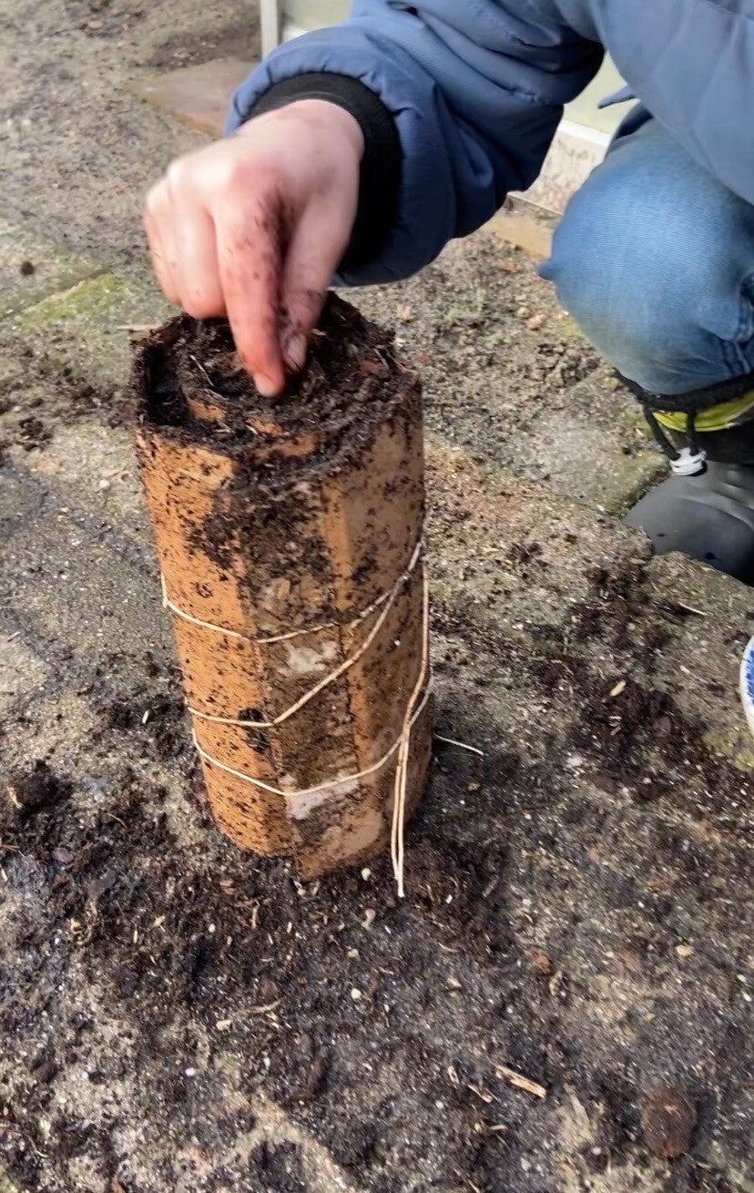 Ik ga rustig door met binnen voorkweken. De vensterbank en verwarming staan al aardig vol. De avocadopit is de volgende fase in gegaan. Het worteltje is ongeveer een centimeter lang dus hij staat nu in een beker met z'n kontje in het water. Hij blijft lekker op het water hangen door de satéprikkers die op de rand van de beker liggen. De wortel groeit langzaam lekker verder. Naast dat we snackpaprika's, pepers en watermeloen hebben voor gezaaid, maakten we ook een zadenrollade. Je kan dit met verschillende gewassen doen, maar het is vooral ideaal voor dat waar je veel van wil (er pasten wel 20 zaden in onze rollade!) en wat flink gaat wortelen. Samen met onze zoon zaaide ik lathyrus (ook wel siererwt of geurerwt genoemd) in deze rollade. Het is niet meer dan karton met potgrond of stekgrond ertussen. De zaden leg je alleen op de bovenkant en de hele rollade gaat in een bakje met water. Nu staat hij nog even in onze inpandige schuur. Daar is het fris, maar niet té koud. Als het niet meer vriest, verhuist hij naar de kas.