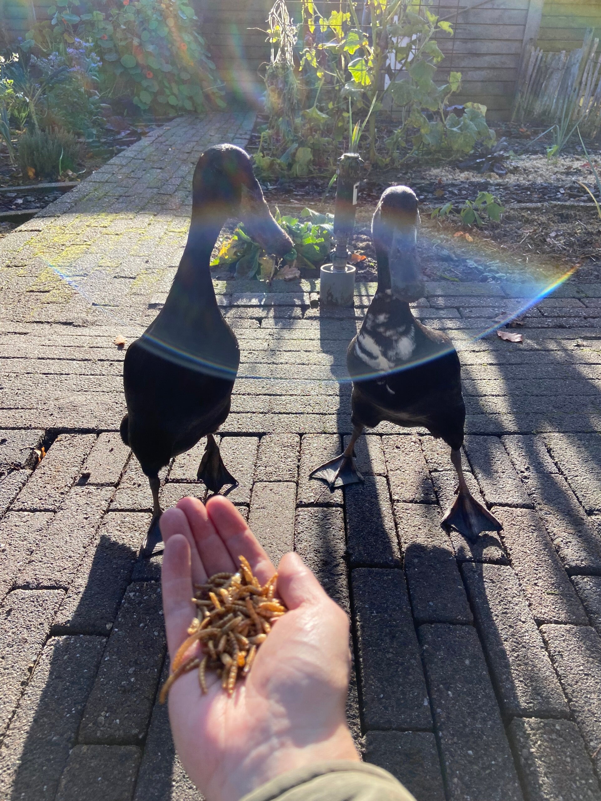 Deze week lukte het me om Spot en Bep voor het eerst uit mijn handen te laten eten! Oké, voor wat lekkere meelwormen doen ze heel veel, maar dit was echt een mijlpaal! Spot en Bep zijn Indische loopeenden, ideale dieren voor iedereen met een moestuin. Ze zijn namelijk dol op slakken. En echt, ze zijn hier nu een half jaar en er is geen slak meer te bekennen in onze moestuin. Daarnaast is ook hun mest heel handig, want deze bevat veel stikstof. In hun huisje ligt zaagsel en als ik hun huisje verschoon, gebruik ik dit zaagsel (plus mest dus) als mulch in de moestuin of op de composthoop. Het blijven natuurlijk prooidieren, dus ze zitten hier in de nacht of als wij weg zijn veilig in een grote overdekte ren. Als we thuis zijn gaat de deur open en kunnen ze lekker vrij rondscharrelen. Zo gezellig!
