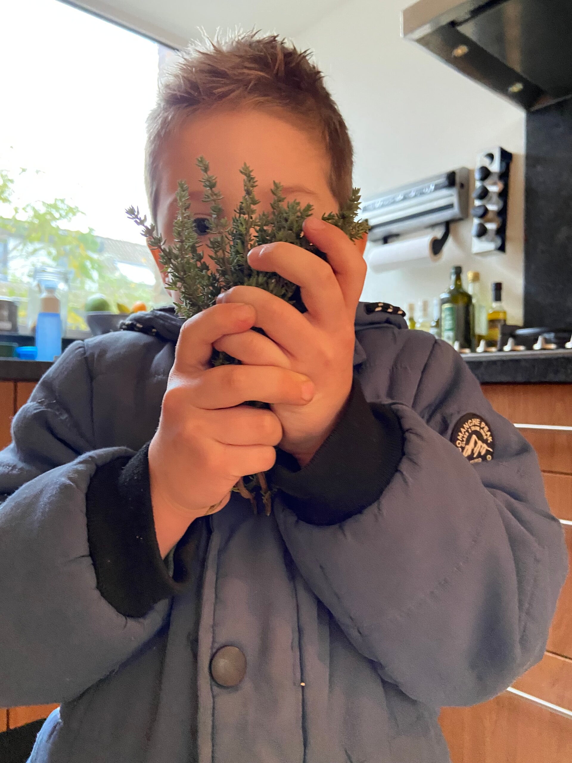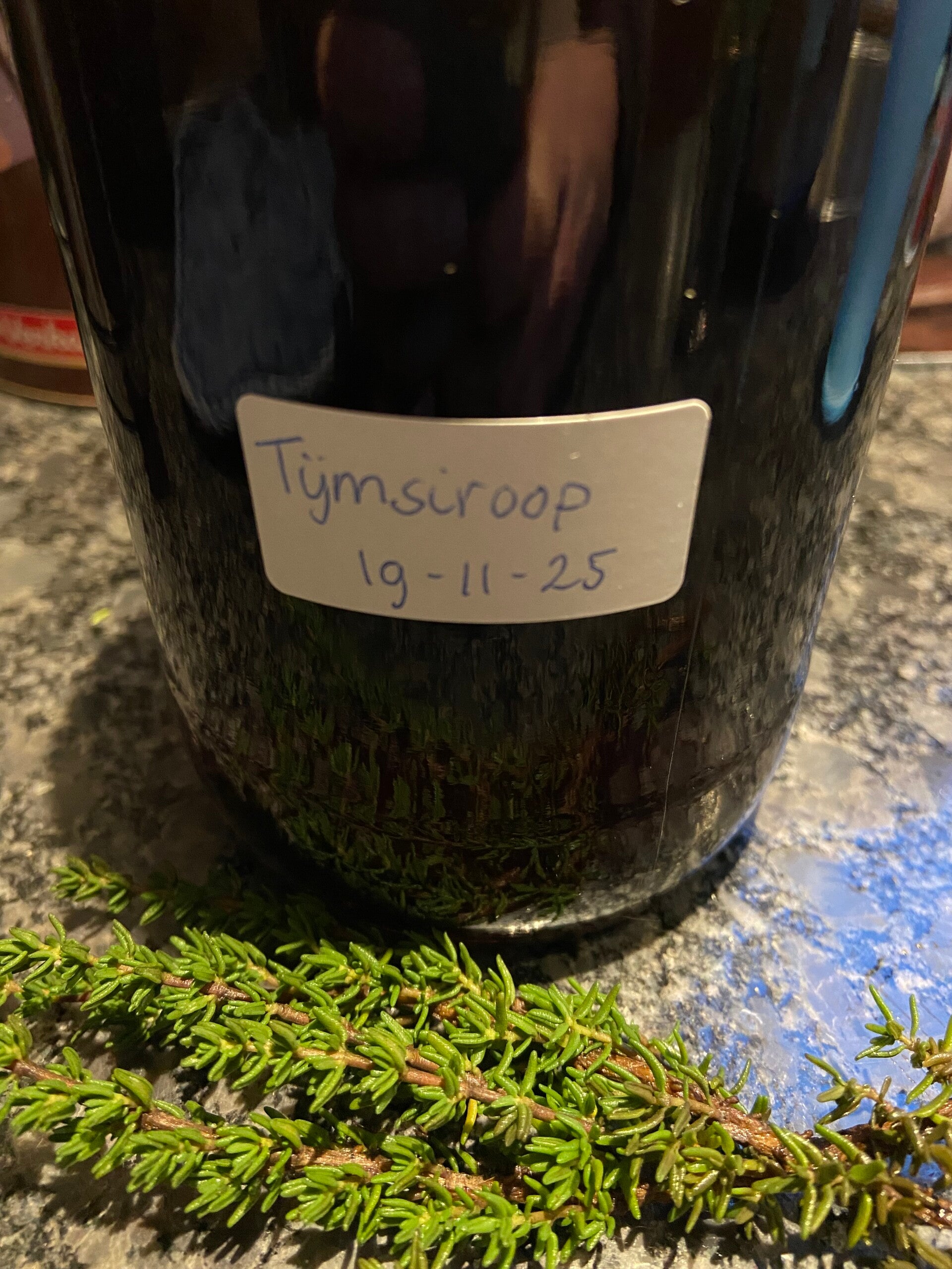 Verder maakten we een siroop van tijm. Handig om op voorraad te hebben in deze tijd van het jaar, want het werkt goed bij keelklachten en hoest. En tijm staat hier toch voldoende in de tuin. Onze zoon had spontaan last van zijn keel, want hij vond het stiekem wel erg lekker!