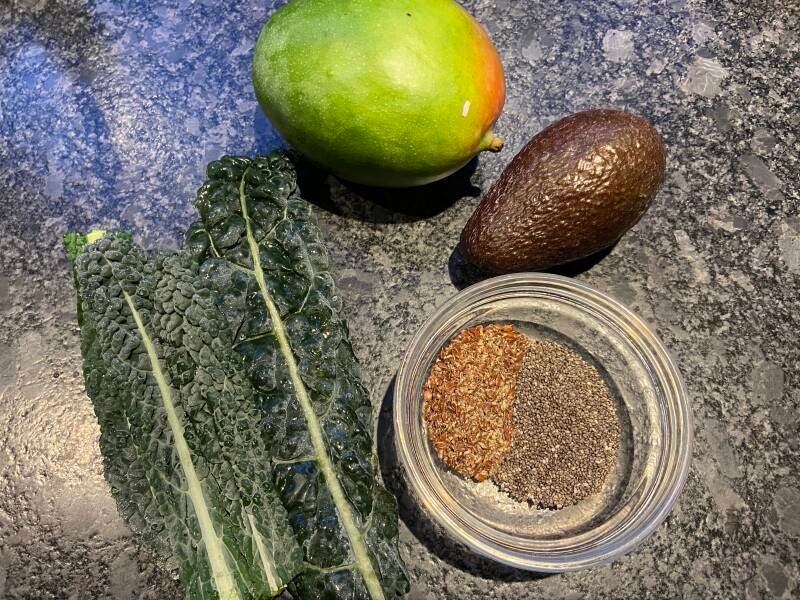 Vervang de banaan en blauwe bessen door een halve mango, de amandelmelk voor het sap van een perssinaasappel, 1 eetlepel lijnzaad door 1 eetlepel chiazaad, of de helft van de palmkool door een kwart komkommer voor wat variatie.
